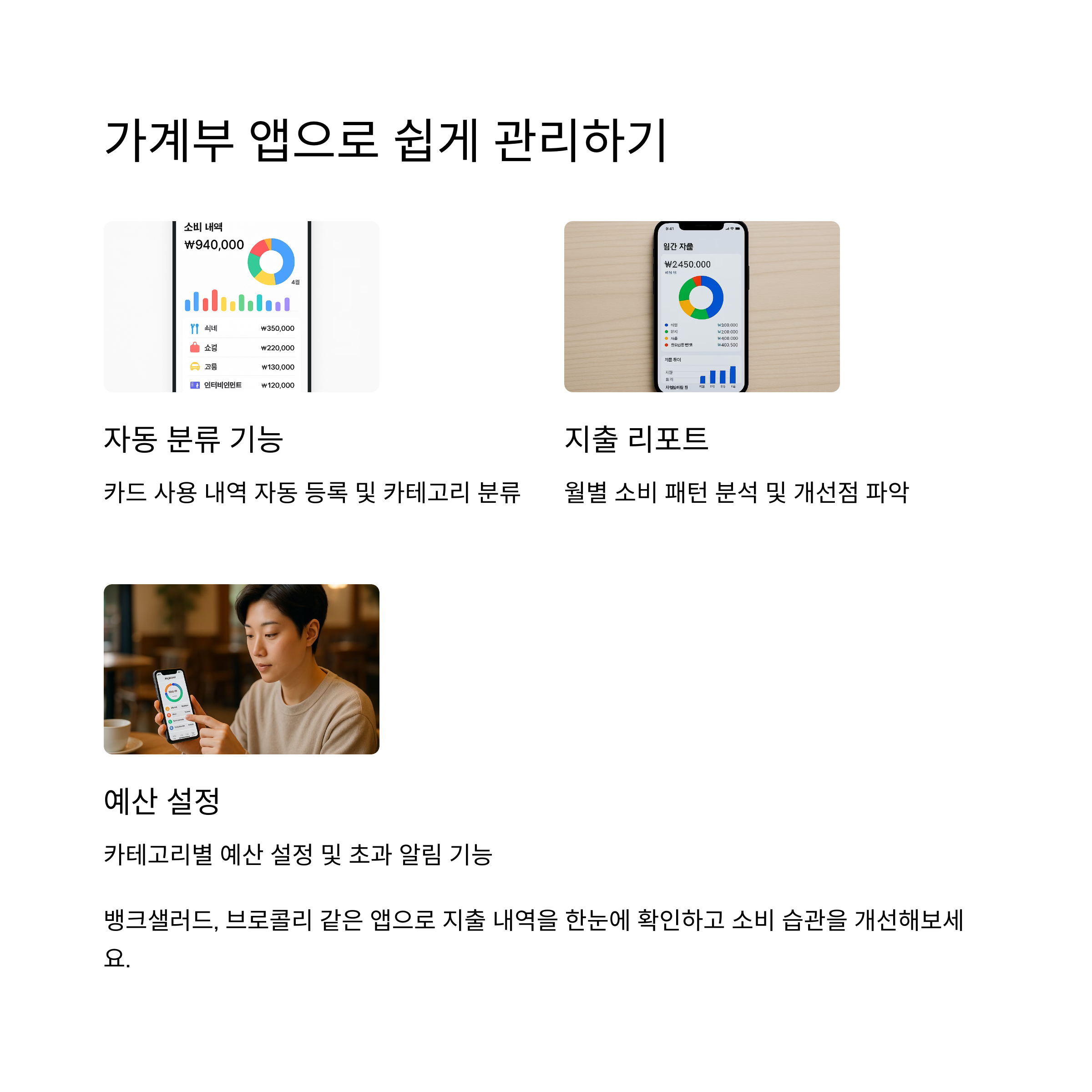 요즘은 정말 똑똑한 가계부 앱들이 많아요! 편하게 수입/지출 기록하고, 월별 통계도 자동으로 나와요. 똑똑한 소비습관, 스마트한 앱에서 시작해보세요. 추천 앱: 뱅크샐러드, 브로콜리, 자비스 가계부