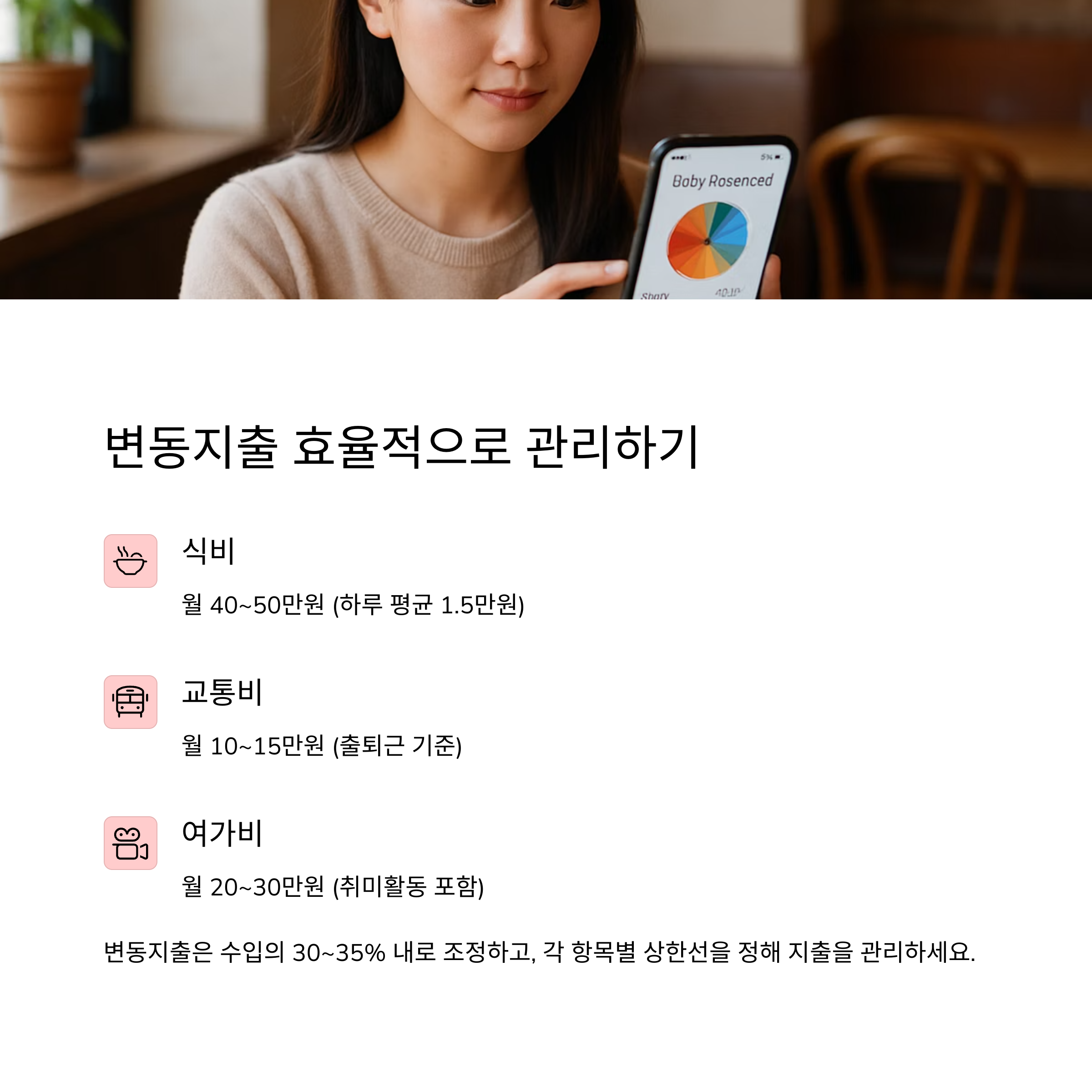식비, 교통비, 쇼핑비 같은 변동지출은 월별로 차이가 클 수 있어요. 지난 3개월간 카드/현금 사용 내역을 분석해서 평균치를 내보세요. 가장 중요한 건, '한도'를 정해놓고 그 안에서 쓰는 것! 예산 초과 알림 설정도 좋은 방법이에요. 📢